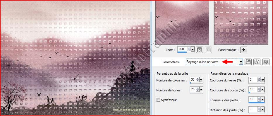 5 - Effets/Effets de Textures/Mosaïque de verre/avec ces réglages: Paysage cube en verre Nombre de colonnes : minimum Nombre de lignes : minimum