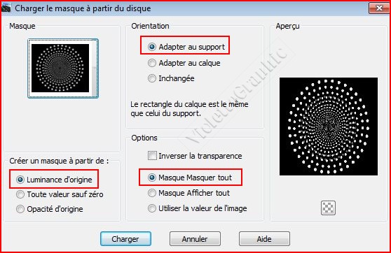 Dans le pavé Masque, cliquez sur la liste déroulante pour faire votre choix parmi les fichiers de masques et d’images. Le pavé Aperçu affiche le masque sélectionné sur le support de l’image. Dans le pavé Orientation, sélectionnez l’une des options suivantes : Adapter au support : adapte le masque au support de l’image actuelle en l’étirant ou en le contractant. Adapter au calque : adapte le masque aux données du calque actuel en l’étirant ou en le contractant Si le calque ne dépasse pas les bords du support, on obtient avec cette option le même résultat qu’avec l’option Adapter au support. Inchangée : place le masque dans la partie supérieure gauche du calque actif Cette option ne modifie pas les proportions du masque Si l’image du masque est plus petite que le calque actuel, Corel PaintShop Pro masque tous les pixels situés en dehors des limites de l’image du masque. Dans le pavé Options, sélectionnez une option pour indiquer si les pixels Corel PaintShop Pro adjacents aux données du masque chargé doivent être affichés ou masqués Ces options affectent le masque uniquement si l’option Inchangée est sélectionnée dans le pavé Orientation et si le masque chargé est plus petit que le support de l’image actuelle. Inverser la transparence : inverse la transparence de l’image du masque Masque Masquer tout : rend les pixels avoisinants noirs afin de cacher les pixels sous-jacents Masque Afficher tout : rend les pixels adjacents blancs afin d’afficher les pixels sous-jacents Utiliser la valeur de l’image : rend les pixels adjacents blancs ou noirs en fonction de l’option appliquée au masque d’origine (Afficher tout ou Masquer tout). Cliquez sur Charger.