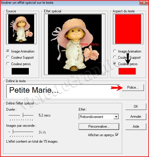 6 - Dans la case Définir l'effet spécial : définir la durée de l'animation Dans la case Effets : choisir l'effet souhaité