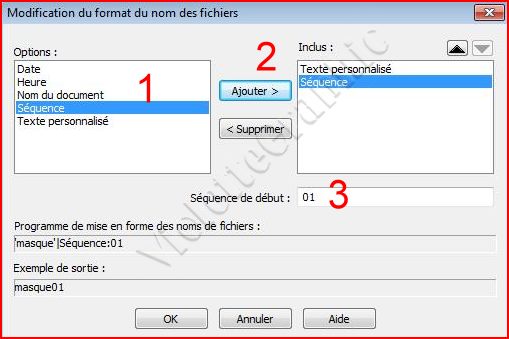 6 - clic sur Modifier une seconde foisclic sur (1) séquencepuis sur (2) Ajouter ..le nom (3) séquence s'affiche dans la fenêtre de droite(4) numéroter le premier masque: ici 01