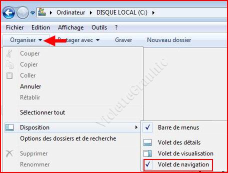 2 - Clic sur Organiser et cocher Barre de menus et Volet de navigation