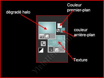 nos couleurs/ le dégradé halo en premier-plan / en arrière-plan  la couleur arrière-plan avec la texture