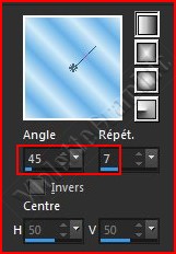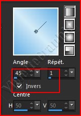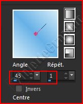 *** Penser à enregistrer souvent votre travail 1 - Placer en premier-plan la couleur #d3ebf7 et en arrière-plan la couleur #67b1e7 Dans la Palette de Style Configurer un dégradé linéaire angle: 45°/Répétition: 1/Inverser coché