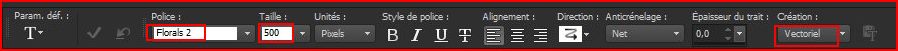 15 - Activer l'outil Texte/Police Florals 2 /taille : 500/vectoriel premier-plan fermé /couleur arrière-plan #67b1e7