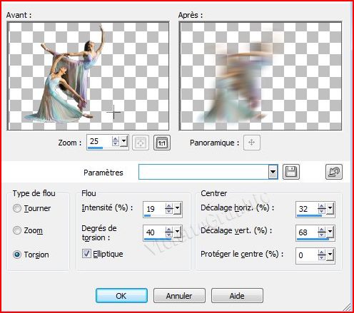 19 - Activer le calque du tube original **Réglages/Flou/Flou radial réglages suivants :