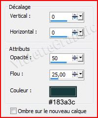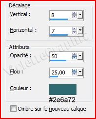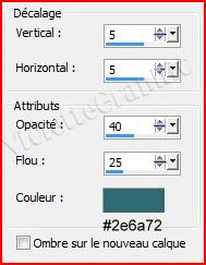**Effets/Effets 3D/Ombre Portée réglages suivants : 1/1/ 50/3 / couleur #2a6a72
