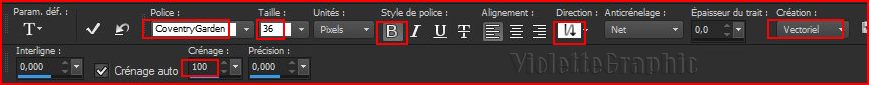 38 - Activer l'outil Texte/Police CoventryGarden/taille : 36/ Style: Bold/ Direction : horizontal et vers le bas /crénage: 100 /vectorielpremier-plan fermé /couleur arrière-plan #326c74