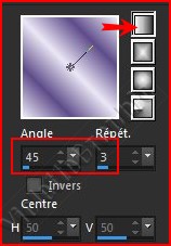 2 - Placer en avant-plan la couleur #ebe7f5 et en arrière-plan la couleur #5f4d8b Configurer un dégradé linéaire : 45°/Répétitions : 3/Inverser non coché