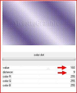 3 - Ouvrir une image transparente de 900 et 550 pixels Remplir de dégradé Réglages/Flou/Flou gaussien : 20 Effets/pentacom/ Color Dot réglages suivants :