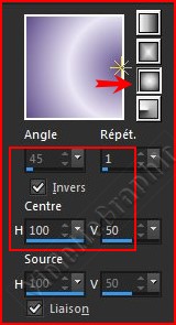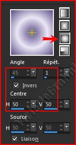 8 - Calques/Nouveau calque Remplir de dégradé halo/répétition : 1/ inverser coché centre : horizontalement :100 / verticalement : 50