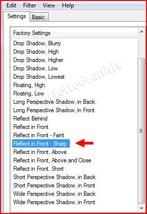 **Effets/Alien Skin Eye Candy Impact /Perspective shadow **Onglet Settings : Reflect in Front:- Sharp