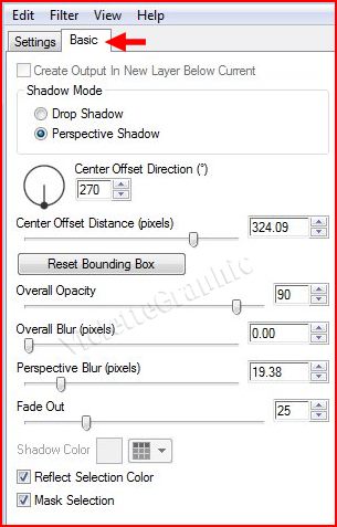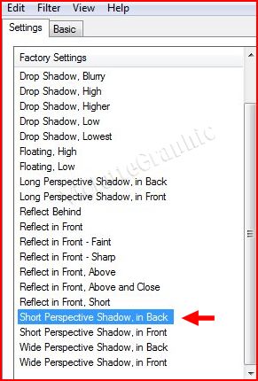 **Effets/Alien Skin Eye Candy Impact /Perspective shadow réglages précédents : Onglet Settings: Short Perspetive Shadow, in Back