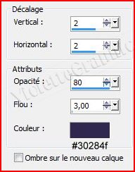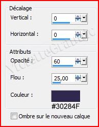 18 - Activer le calque Copie de calque 4 Effets/Effets 3D/Ombre Portée : 0/0/60/25/couleur #30284f