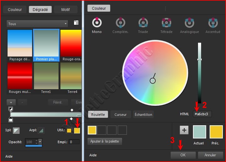 2 - Placer en premier-plan la couleur #d6ebe4 et en arrière-plan la couleur #62807a Dans la Palette de Style rechercher votre dégradé premier-plan/arrière-plan