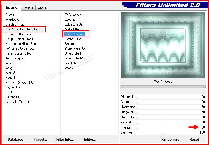20 - Sélection/Sélectionner Tout Sélection/modifier/Contracter de 30 pixels **sélection/Inverser **Effets/Greg's Factory Output Vol.II /Pool Shadow réglages par défaut