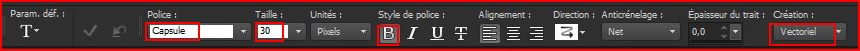 23 - Activer l'outil Texte/Police Capsule /taille : 30/Style: Bold/ vectoriel /crénage: 50premier-plan fermé /couleur arrière-plan #445a54