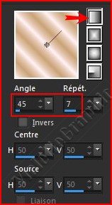 2 - Placer en premier-plan la couleur #fff2f5 et en arrière-plan la couleur #cba376 Dans la Palette de Style Configurer un dégradé linéaire angle: 45°/Répétitions : 7 ( dégradé Corel_06_029 ici )