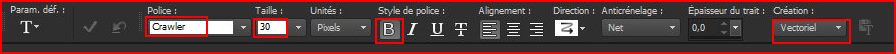 27 - Activer l'outil Texte/Police Crawler /taille : 30/Style: Bold/ vectoriel /crénage: 100premier-plan fermé /couleur arrière-plan #fff2f5