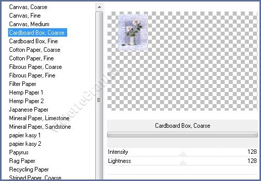 **Effets/Unlimited/Paper textures/Cardboard Box, Coarse réglages suivants :