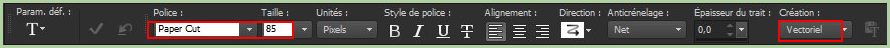 14 - Activer l'outil  Texte/Police Paper Cut/taille : 85/ vectoriel/crénage : 25