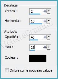 25 - Activer le calque supérieur Effets/Effets 3D/Ombre Portée : 2/15/40/25/couleur #000000