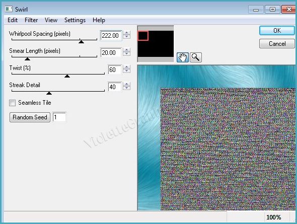 **Réglages/Flou/Flou gaussien : rayon : 20 **Effets/Eye Candy 4000 / Swirl réglages suivants: