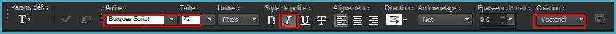 26 - Activer l'outil Texte/Police Burgues Script/ Taille : 72/style: italique/ Vectoriel /crénage : 50 avant-plan fermé/couleur arrière-plan #ffffff