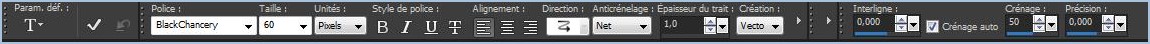 27 -Activer l'outil texte /Police BlackChancery/taille : 60/trait : 1 pixel/vectoriel/crénage : 50