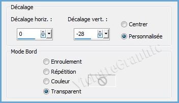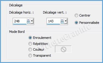 23 - Activer le tube AnaRidzi1488.pspimage Edition /Copier/Edition/Coller comme nouveau calqueImage/Redimensionner à 80% x 2 fois/décocher " Redimensionner tous les calques" **Effets/Effets d'image/Décalage réglages suivants :