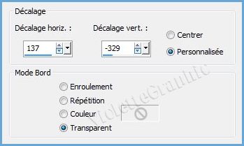 20 - Calques/Dupliquer Image/Redimensionner à 85%/décocher " Redimensionner tous les calques" **Effets/Effets d'image/Décalage réglages suivants :