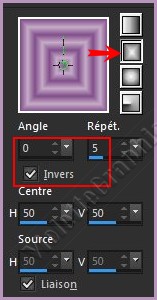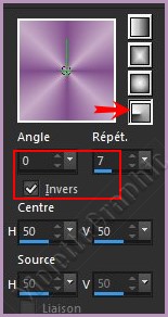 2 - Placer en premier-plan la couleur #c6acc7 et en arrière-plan la couleur #814e8c**Configurer un dégradé radial angle: 0°/Répétitions : 7/Inverser coché