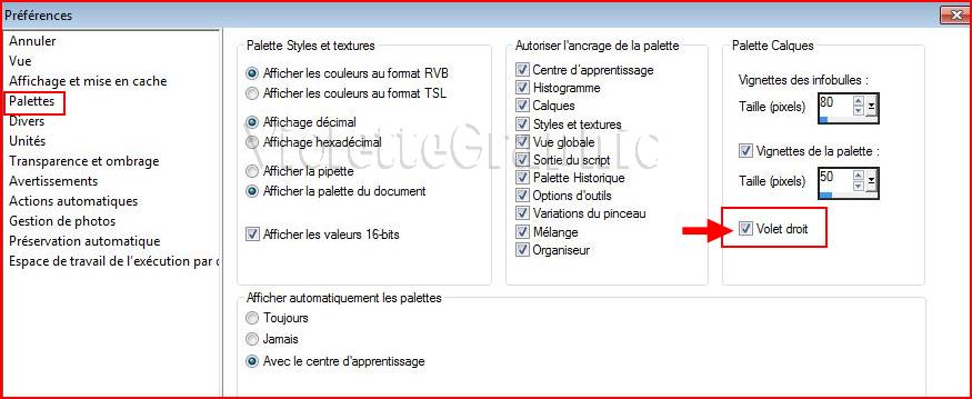 02 - clic sur Palettes cocher la case devant volet droit pour nous permettre de voir le contenu de nos calques