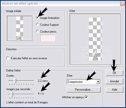 cocher "image Animation" /Durée : 2,2 secs/Images par seconde : 4/Effet: Compression