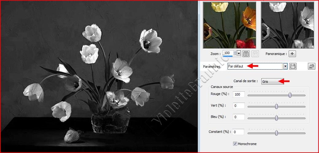 une bonne habitude : Toujours...faire un duplicata de votre image Dans la barre de menu /Cliquer sur Fenêtre/Dupliquer *Fermer l'originale *** Pour mélanger des canaux chromatiques*** 2 - Activer votre image Réglage/Couleur/Mélange des canaux réglages par défaut **Ouvrir la liste déroulante des différents paramètres :