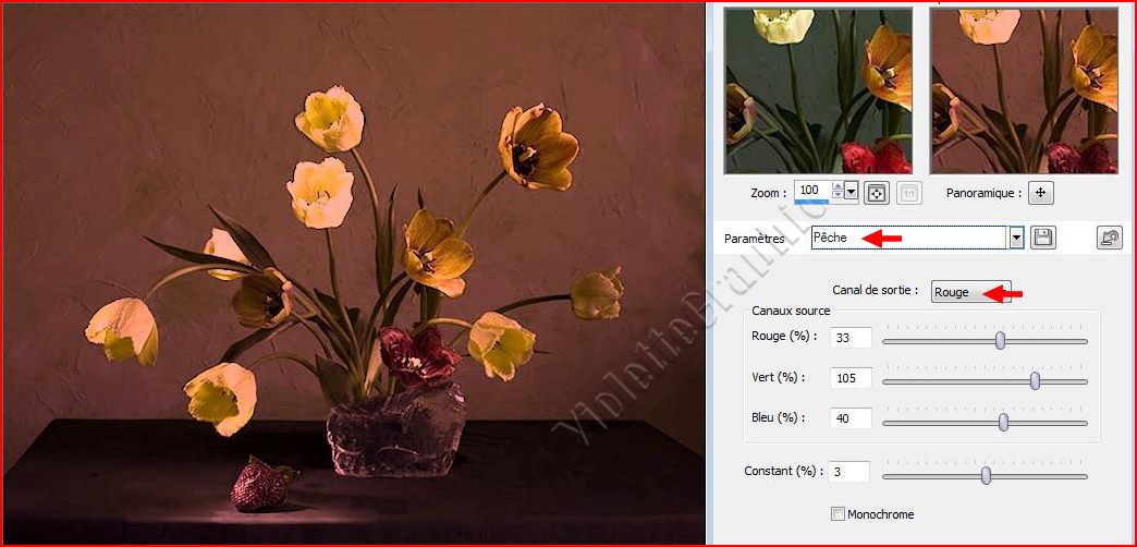2 - Réglage/Couleur/Mélange des canaux réglages suivants : Pêche