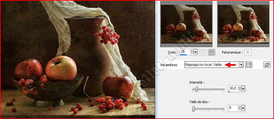 5 - Réglage/ Luminosité et contraste/ Mappage ton local réglages suivants: Mappage ton local - faible