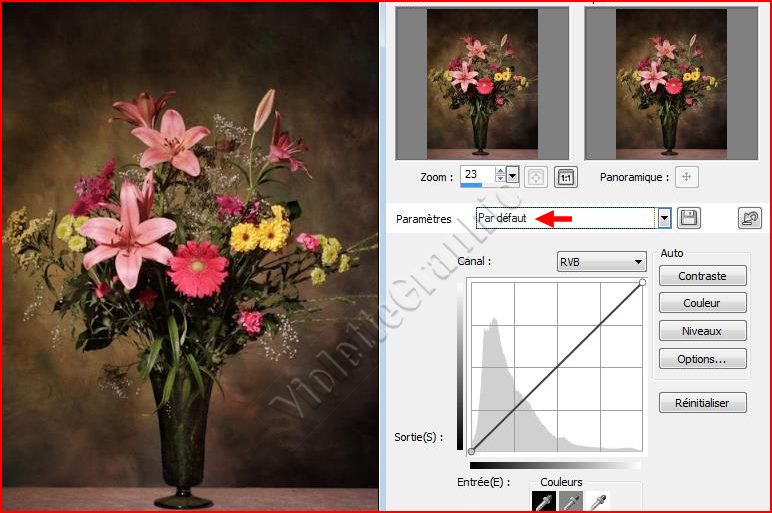 2 - Activer votre image ** Réglage/Luminosité et contraste/ Courbes réglages par défaut**Ouvrir la liste déroulante des différents paramètres :