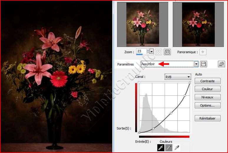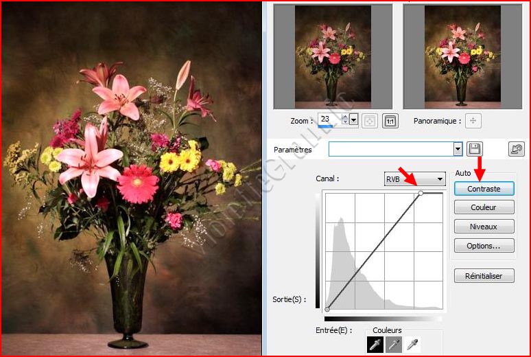 5 - Réglage/Luminosité et contraste/ Courbes réglages persos :**Régler le contraste de la photo automatiquement Cliquez sur le bouton Contraste dans le pavé Auto