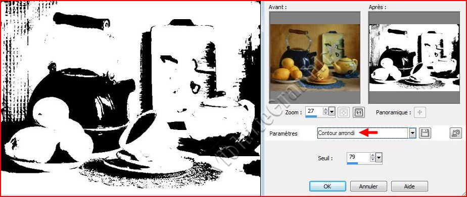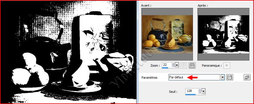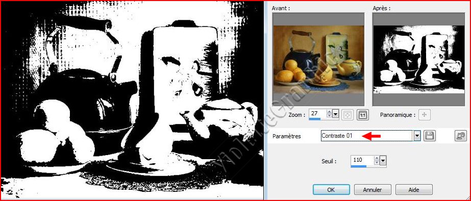 une bonne habitude : Toujours...faire un duplicata de votre image Dans la barre de menu /Cliquer sur Fenêtre/Dupliquer *Fermer l'originale *** 2 - Activer votre image **Réglage/Luminosité et Contraste/seuil réglages par défaut **Ouvrir la liste déroulante des différents paramètres :