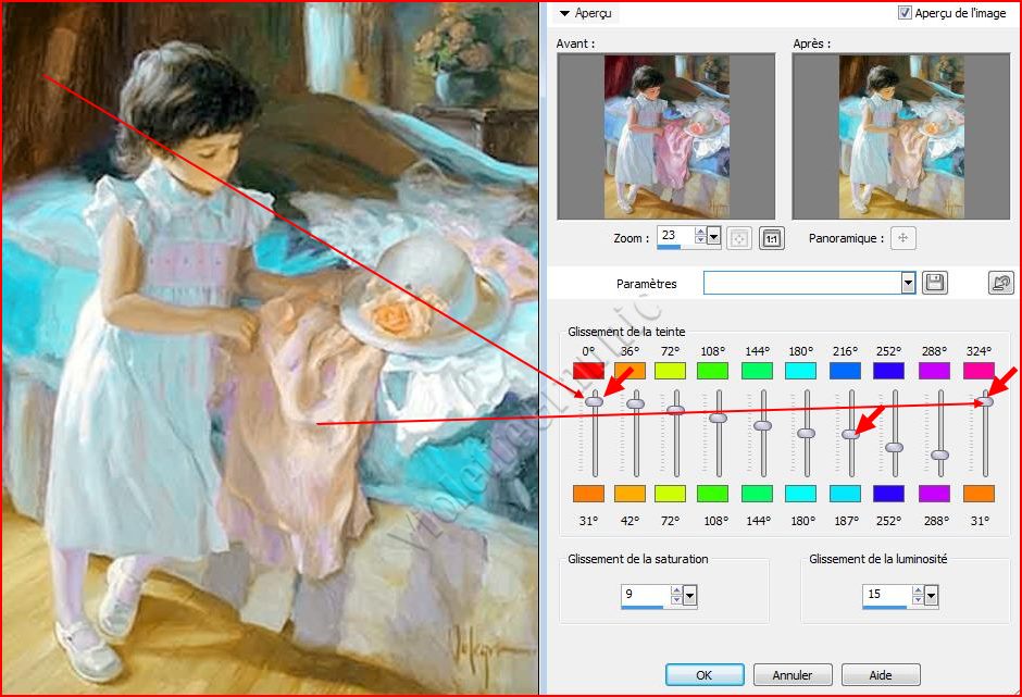 *** 2 - Activer votre image **Réglages/Teinte et Saturation/Glissement de la teinte réglages par défaut Ouvrir la liste déroulante des différents paramètres :