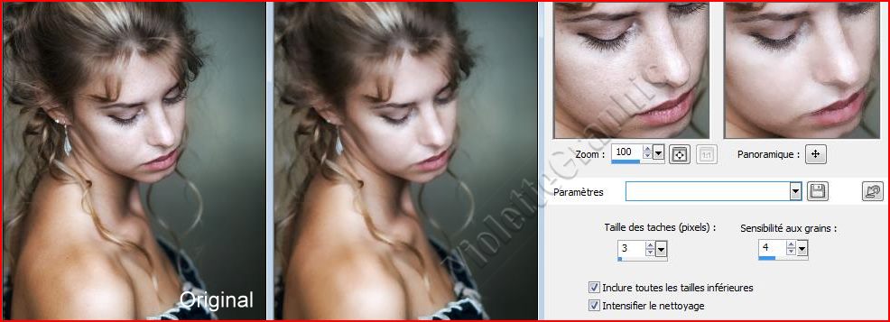 *** Pour supprimer des taches sur plusieurs pixels*** Sélectionnez la zone contenant les taches Choisissez Réglage /Ajouter/supprimer du Bruit/Nettoyer La boîte de dialogue Nettoyer s’affiche