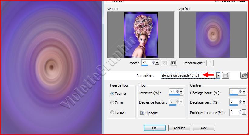 3 - Réglages/Flou/Flou radial réglages suivants : Etendre un dégradé 45°