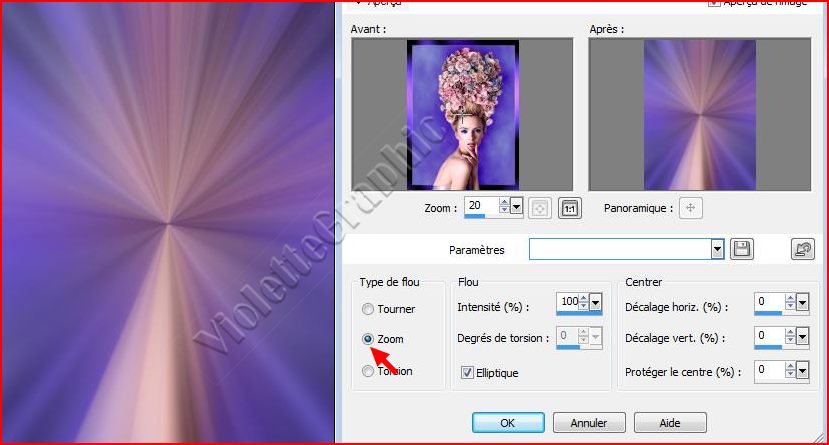 3 - Réglages/Flou/Flou radial réglages suivants : zoom