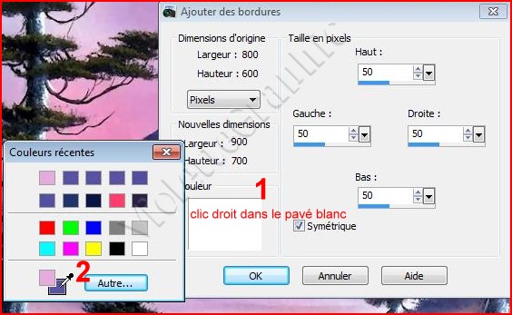 4 - Dans la barre de menu Cliquer sur Image/Ajouter des bordures de 50 pixels/ Symétrique coché **clic droit dans le pavé blanc **clic droit dans la couleur arrière-plan de la boîtes de Couleurs récentes