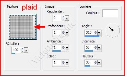 **Dans la fenêtre qui s'ouvre cliquer sur la petite flèche et aller chercher la texture : "Plaid" Placez ces réglages :