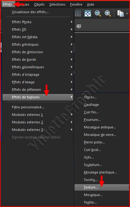 4 - Dans la barre de menu /Cliquer sur Effets /Effet de textures/Textures :