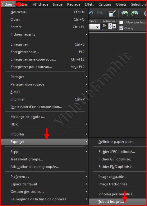 6 - Nous allons l'enregistrer avec les tubes du logiciel Dans la barre des menus/Cliquer sur fichier/Exporter/tube à images