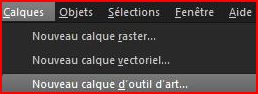 Les calques d’outils d’art sont créés automatiquement lorsque vous utilisez les outils d’art Vous pouvez également convertir les calques d’outils d’art en calques raster Vous pouvez choisir de créer une nouvelle image avec un calque d’outil d’art Vous pouvez également choisir une texture de support sur laquelle appliquer un pigment d’outil d’art, une couleur de remplissage ou une couleur de support 1 - Pour créer un calque d’outil d’artChoisissez Calques/ Nouveau calque d’outil d’art