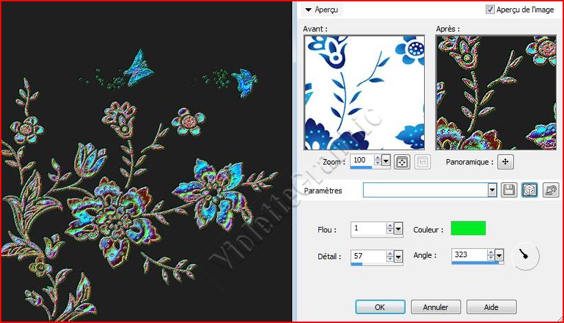 Flou : permet de déterminer la douceur de l’image Détail : permet de définir l’intensité de l’effet Couleur : permet de choisir la couleur de la lumière éclairant l’image Angle : détermine les bords qui seront clairs ou ombrés *** 3 - Avec ces réglages Flou : à 1 Détails : 57 : avec une faible valeur Lorsque vous augmentez cette valeur, la couleur est appliquée à plus de zones de contraste