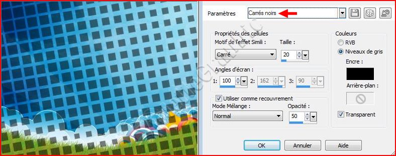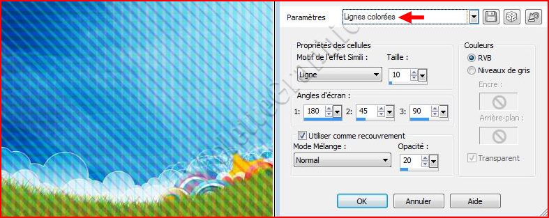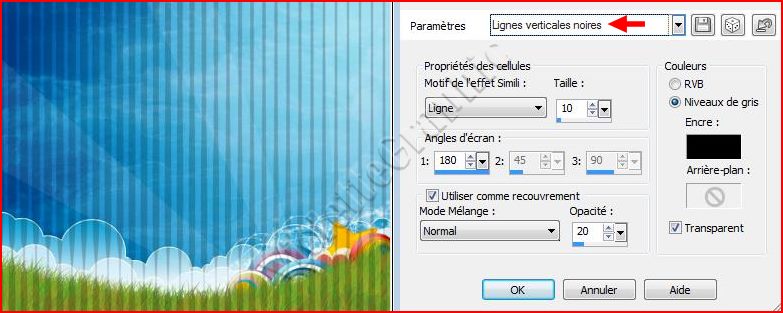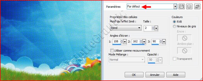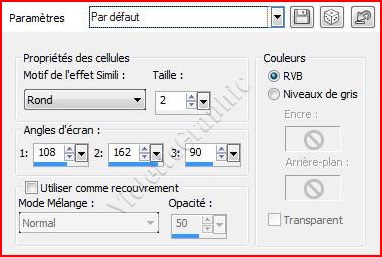 Motif Simili : permet de choisir un motif linéaire, rond ou carré Taille : permet de choisir la taille du motif Angles d’écran : permet de choisir les angles de l’écran Utiliser comme recouvrement : permet de régler l’intensité de l’effet et d’appliquer un mélange Mode Mélange : permet de choisir l’un des nombreux effets de mélange disponible Opacité : permet de définir l’intensité de l’effet RVB : permet de traiter les canaux du rouge, du vert et du bleu séparément Niveaux de gris : permet de choisir les couleurs du motif et de l’arrière-plan Encre : permet de choisir la couleur du motif Arrière-plan : permet de choisir la couleur de l’arrière-plan